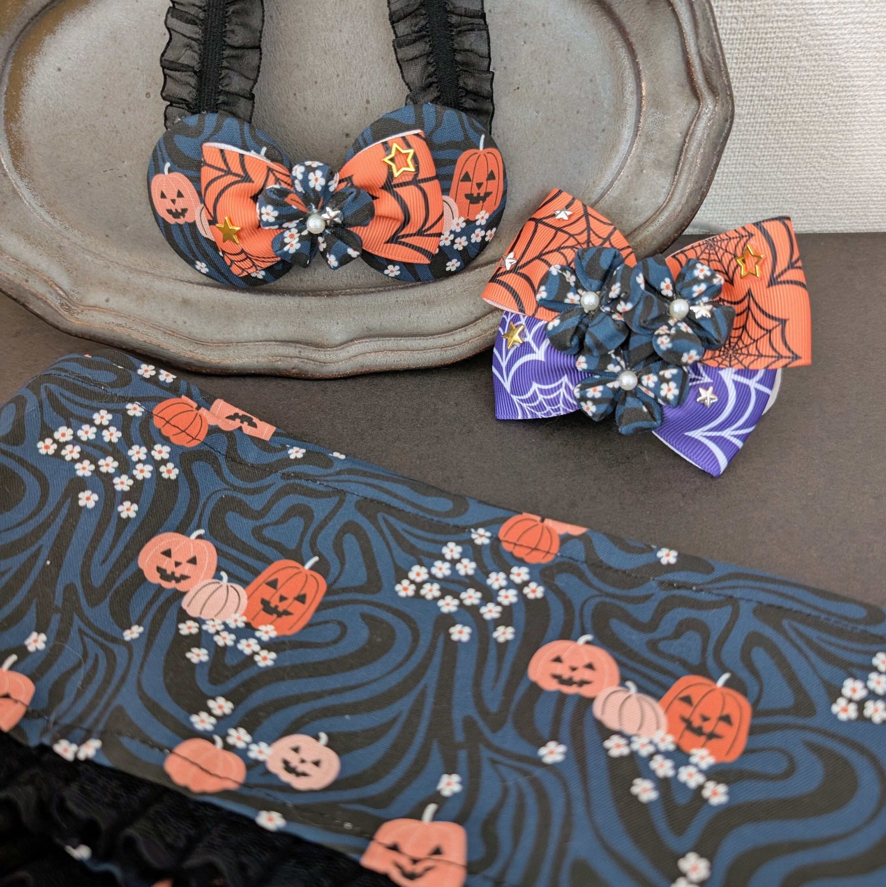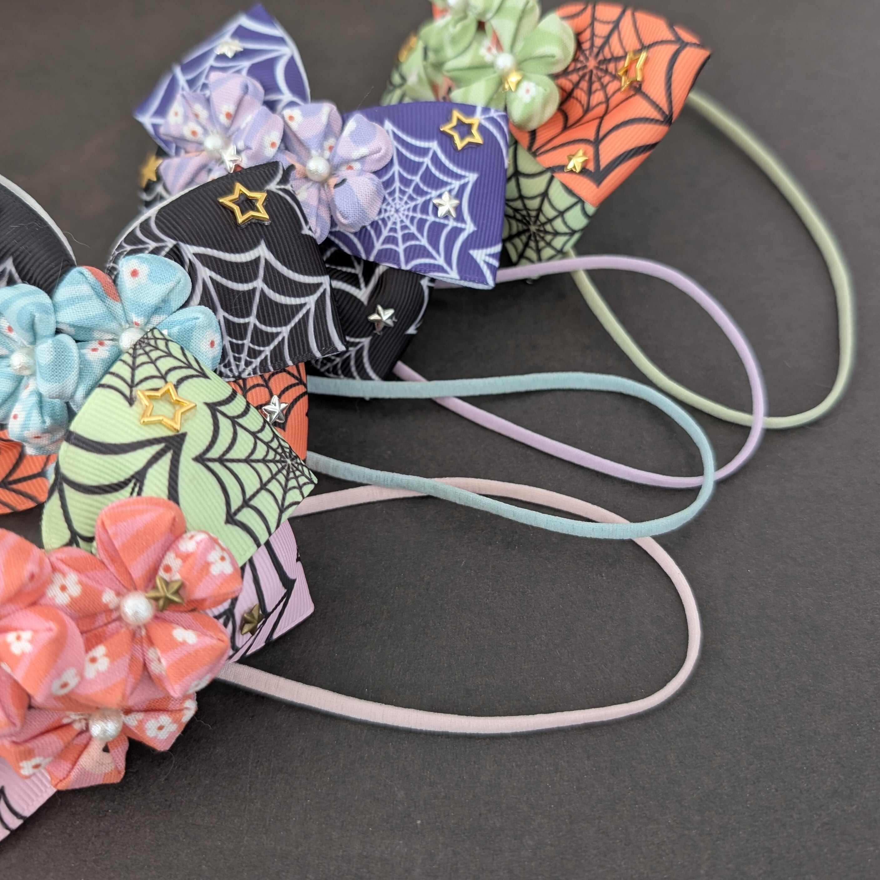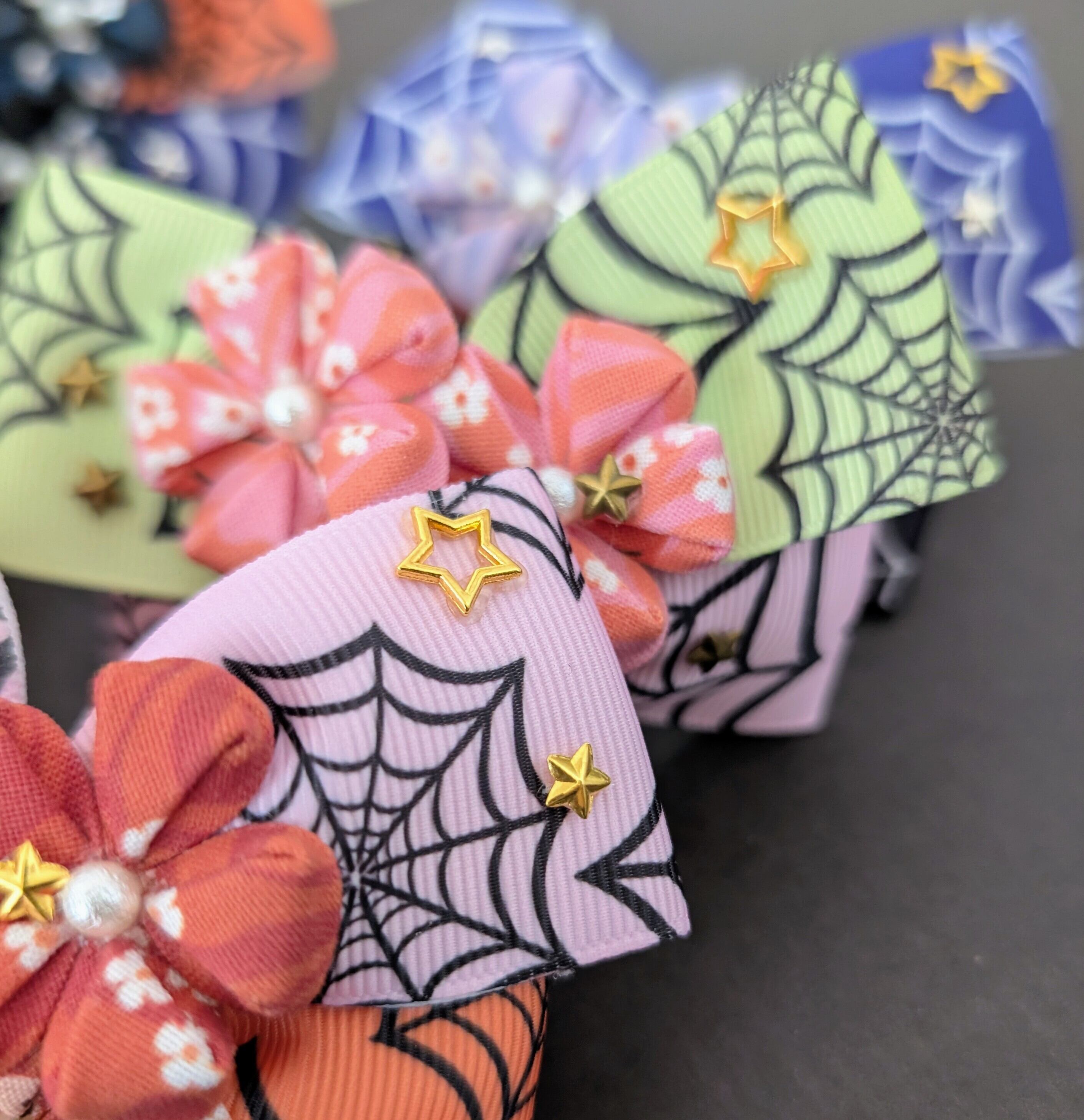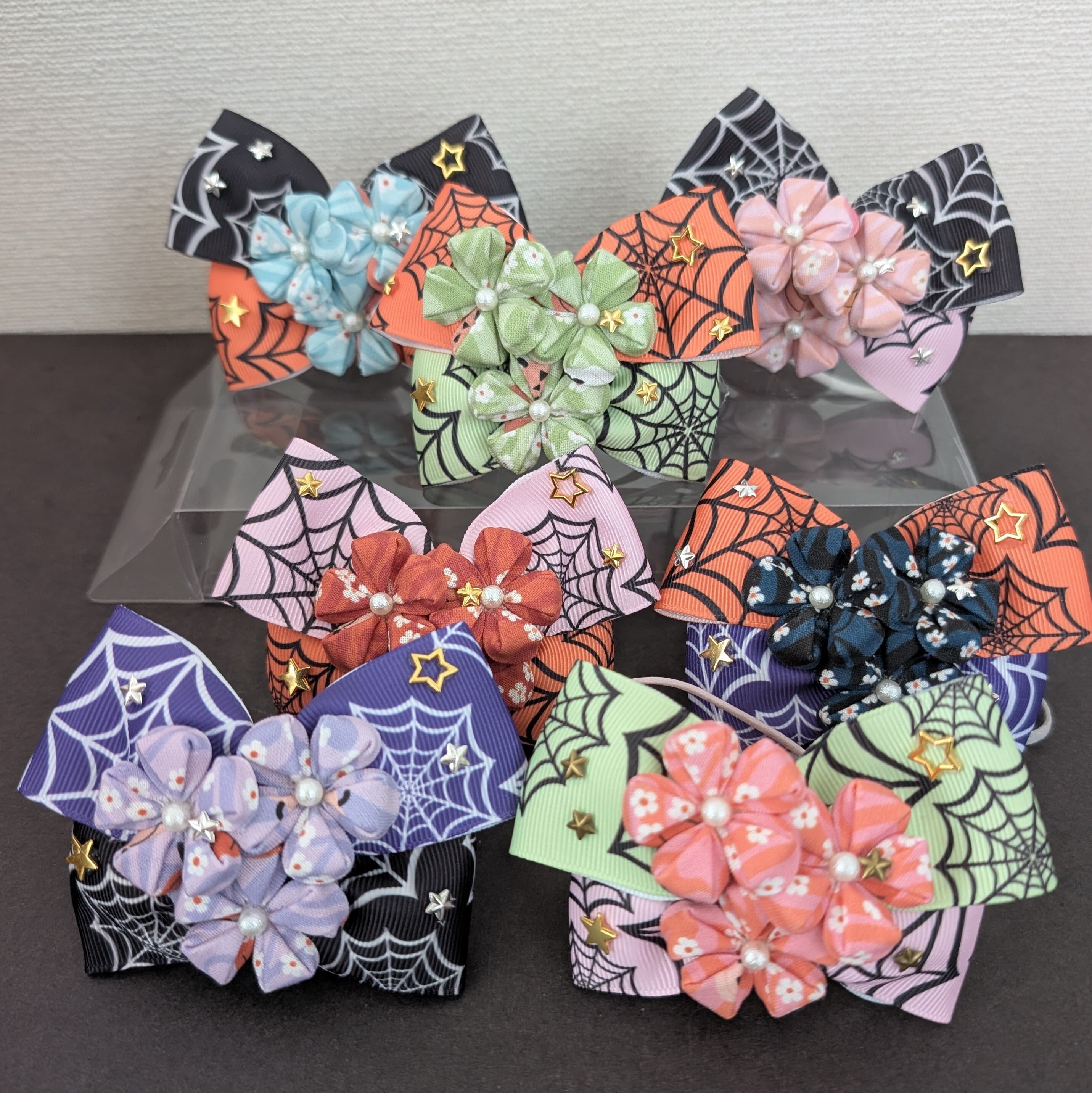つまみ細工のお花と蜘蛛の巣柄のリボンの