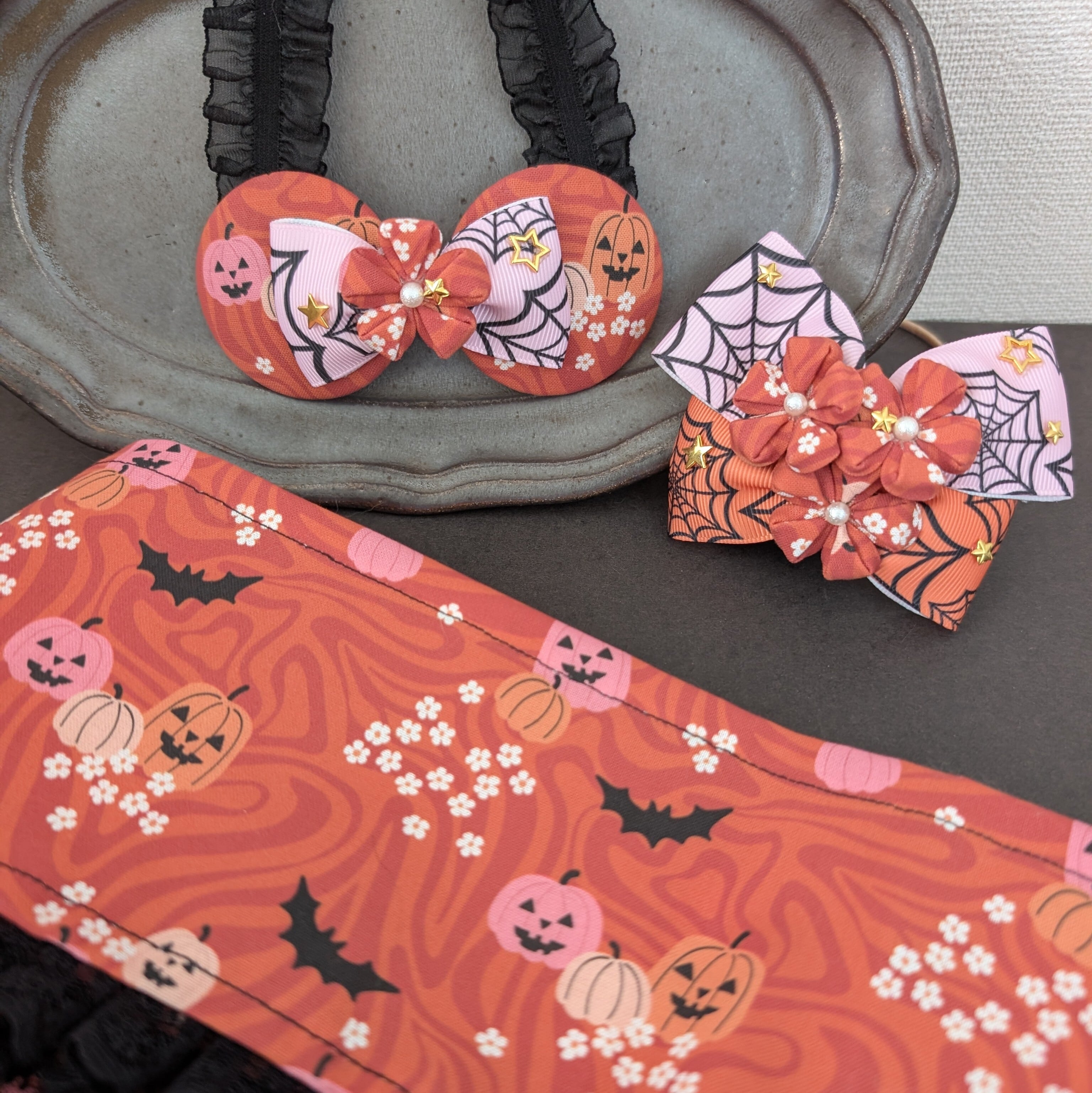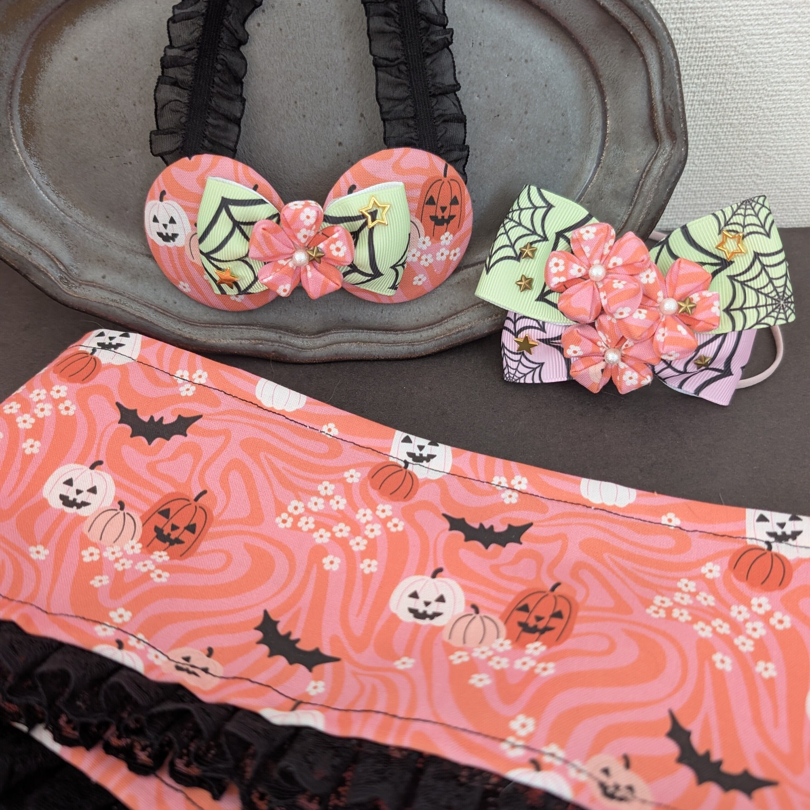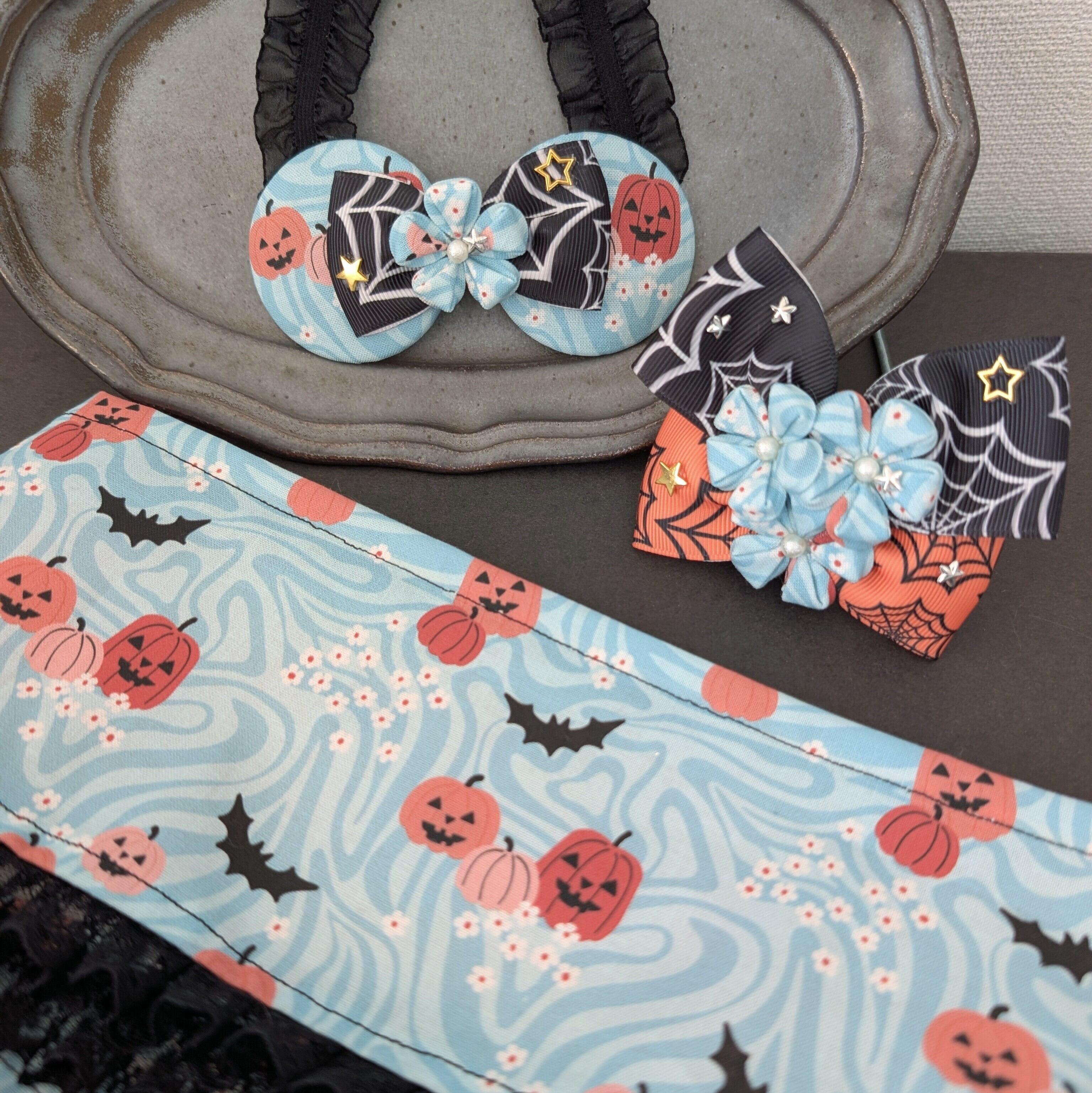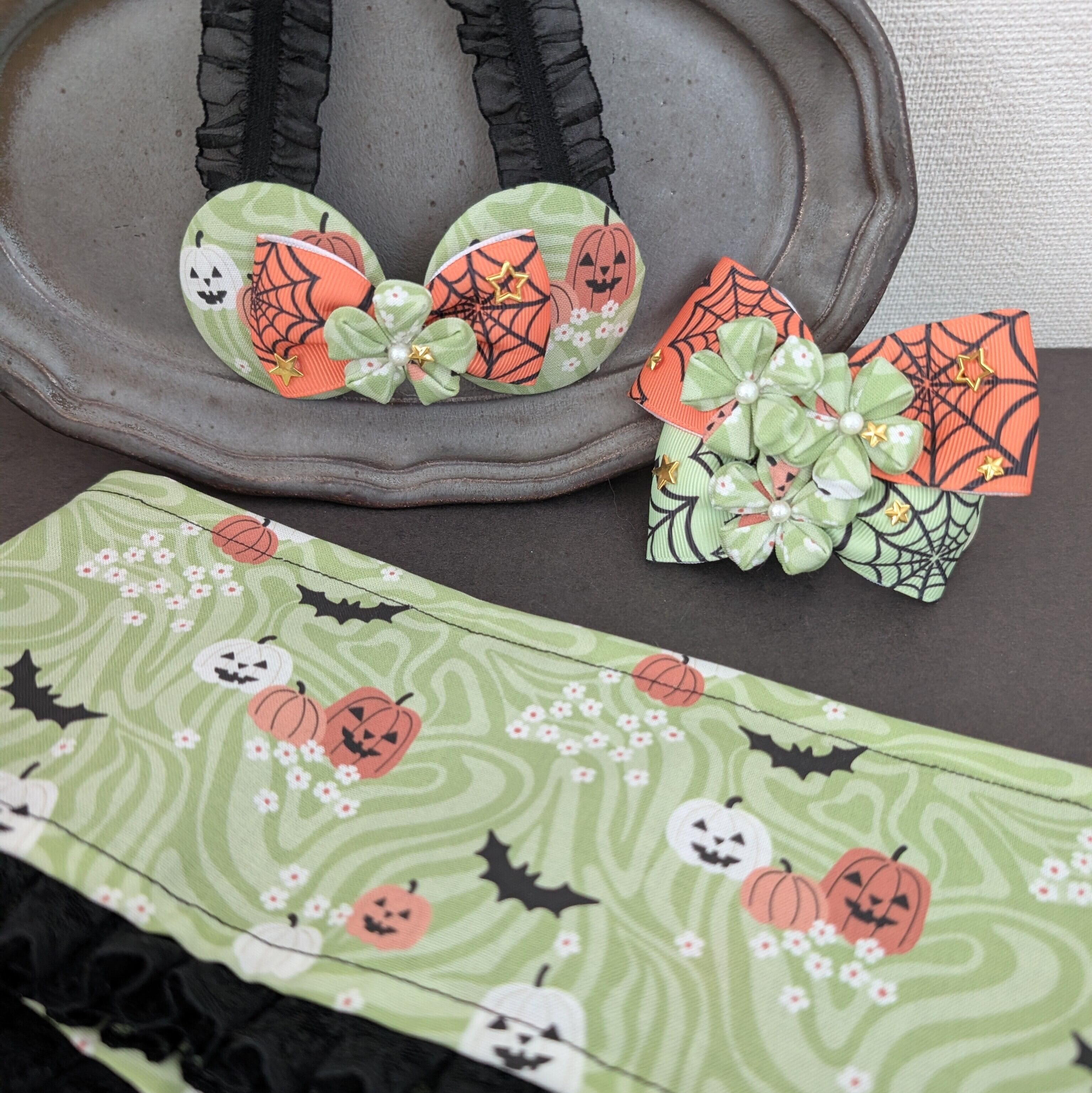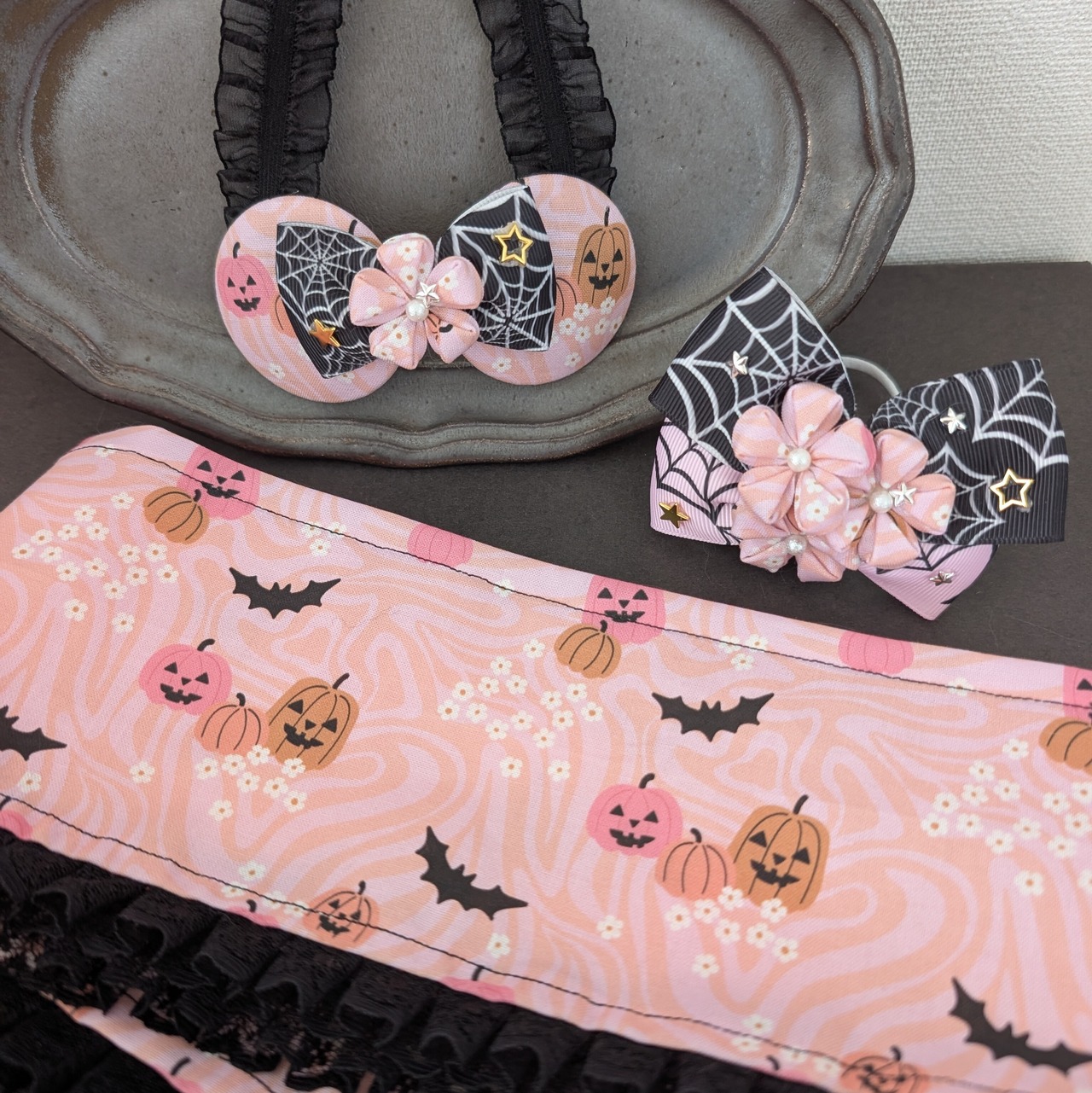つまみ細工のお花と蜘蛛の巣柄のリボンの